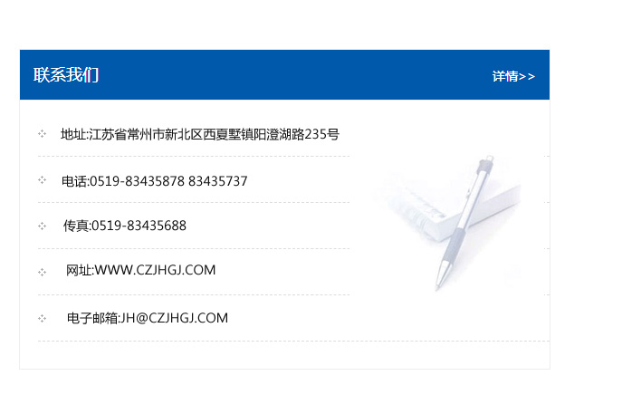 地址:常州市新北區友邦商務大廈1幢16、17層  電話:0519-85101652  傳真:0519-85112595  郵編:213022  網址:www.cz-jiayue_cn.huanxinny.com  郵箱:xiajifengaa@163.com